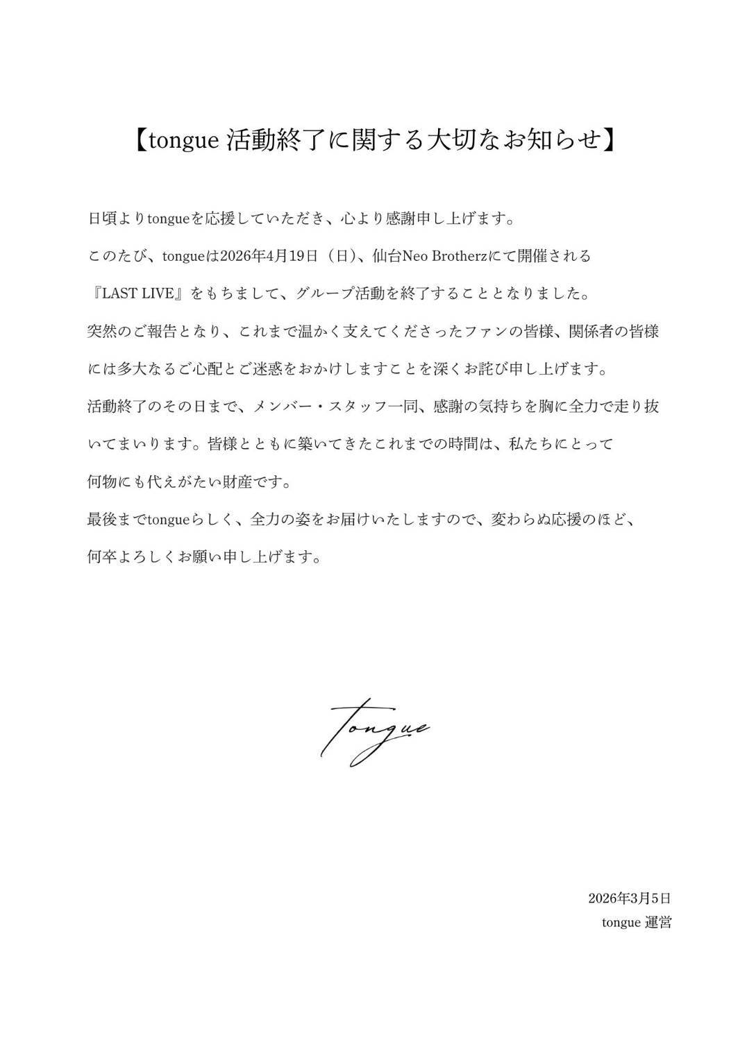 (tongue)活動終了に関する大切なお知らせ