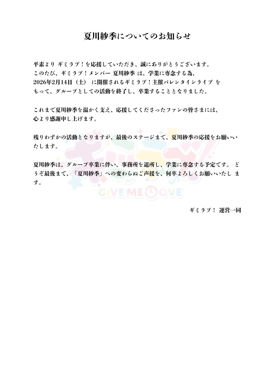 (ギミラブ!)夏川紗季 卒業 のお知らせ